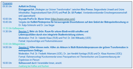 Die nächste Veranstaltung - KoMet-Tag 2025 „Grüne Transformation Ruhr“ - findet am 5. Dezember 2025 in den Räumen des Regionalverbands Ruhr statt (Kronprinzenstraße 35, 45128 Essen). Das Programm bietet Einblicke in "Strategien zur Grünen Transformation", "Raum für urbane Diversität und integrierte Stadtentwicklung" sowie in die Rolle von Häfen in der Grünen Transformation.